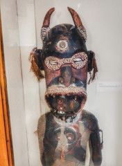 The mudmen could not cover their faces because legends said the mud from the Asaro river was poisonous. So instead, they made masks with scary features, strange ears and fierce eyes, and decorated them with wild pigs' teeth and tusks and fashioned wild grimaces. When they then went on raids to neighbouring villages, they would come in the pre-dawn, creeping out of the mountain mists like ghoulish spirits, their fearsome appearance giving a psychological battle advantage.